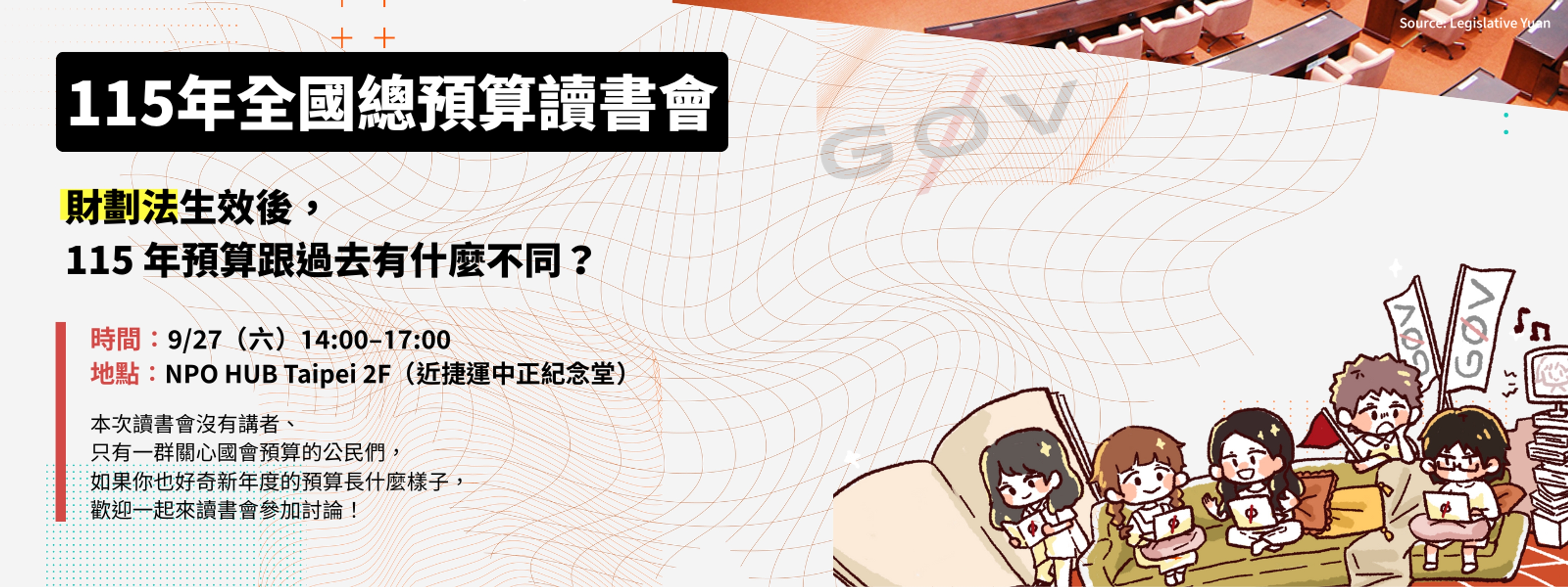 :loudspeaker: *g0v 國會松|115年全國總預算讀書會* 115 年全國總預算出爐囉! 你知道嗎?預算不只是數字,而是政策的方向與執行力所在。 從台灣的基礎建設、到你家巷口的道路改善,每一筆經費背後,都是資源分配與政治選擇,也與我們的日常生活息息相關。 g0v 國會松長期關注預算透明與國會監督,這次我們舉辦了一場「總預算」讀書會, 我們目前已經有初步做了一些資料整理、只等請你一起打開預算書, 讓我們透過自己的手指和眼睛挖線索、找問題! *如果你還在猶豫是否要來參加,可以問問自己:* :file_folder: 我關注的議題,今年有沒有什麼變動? :file_folder: 財劃法上路後,中央和地方的預算分配會有什麼差異嗎? :file_folder: 我身邊是否有其他關心預算的夥伴可以一起討論? 如果你好奇,也想了解政府到底打算怎麼花錢、做什麼事, 或單純想知道怎麼看預算書、想要乾淨的預算資料, 都歡迎你加入這場讀書會,一起加入國會松的行列! `活動資訊` :spiral_calendar_pad:時間:9/27(六)14:00–17:00(13:30開放入場) :round_pushpin: 地點:NPO HUB Taipei(台北市中正區重慶南路三段 2 號 2 樓,近捷運中正紀念堂站) :admission_tickets: 報名連結:<https://reurl.cc/A3lRYd>(僅開放實體票)