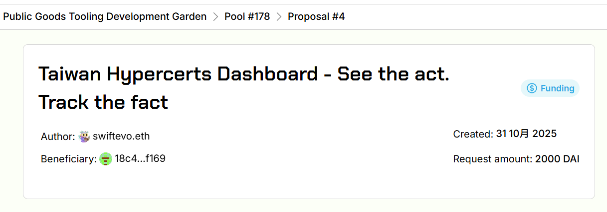 Taiwan Hypercerts Dashboard - See the act. Track the fact <https://t.co/WzmmgOOM8j> We just submitted our application on @gitcoin GG24 Public Goods Tooling Development on @gardens_fund @hypercerts @greenpillnet @FAB_DAO