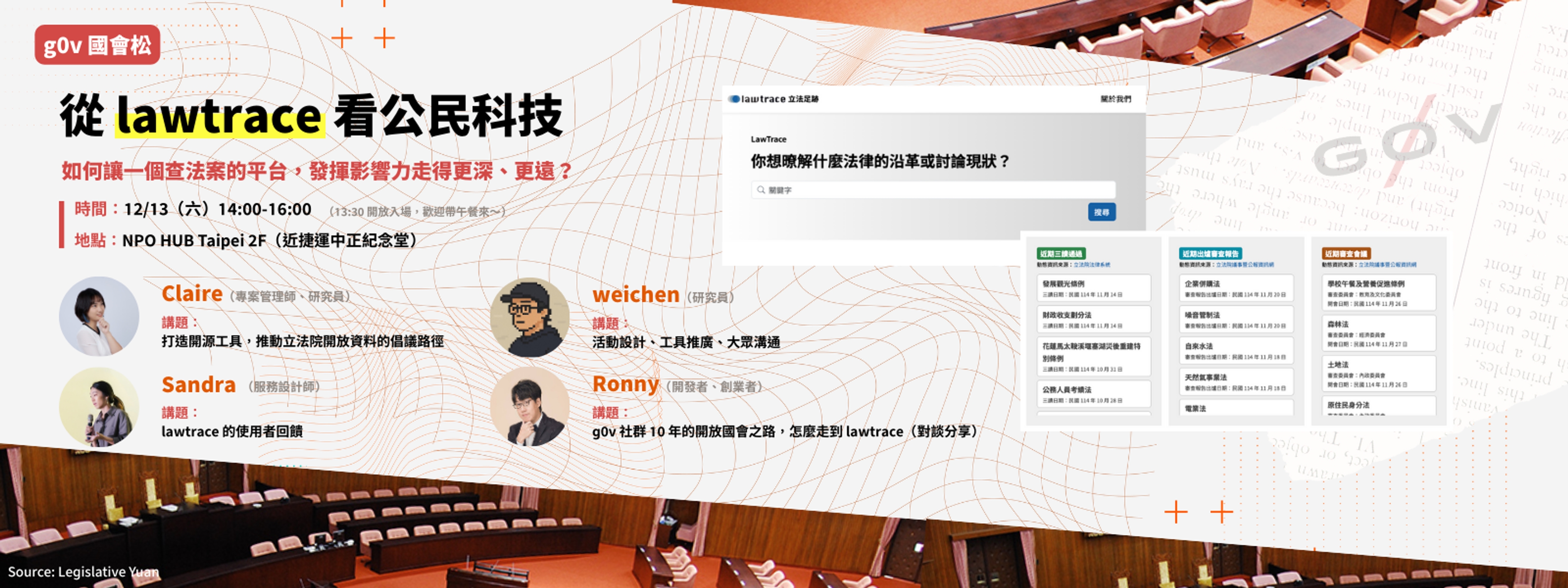 歐噴有限公司 誠摯邀請關注立法歷程、法律與政策倡議、國會工作與大眾溝通的夥伴,一起參加 LawTrace 線上分享活動。在我們設計的兩場活動中,我們將: 介紹 LawTrace 的核心功能與目標應用場景, 分享 實際使用經驗與工作上的啟發, 公布 最新功能與未來開發方向。 透過這次交流,您將更了解 LawTrace 如何協助您更高效地追蹤法案、分析政策脈絡,並掌握國會資訊的即時變化,讓法律與政策資訊更開放、透明且可被運用。 -- 活動時間:分別於 11/7(五)及 11/18(二)晚上 08:00 - 09:30 辦理。 參與連結:將於活動行前信內通知,信件預計在活動前兩天發送。 議程概要: 活動開場 介紹 LawTrace 與立院資料 分享實際應用案例 Feature Drop(重大更新分享) Q&A 與回饋![]()
