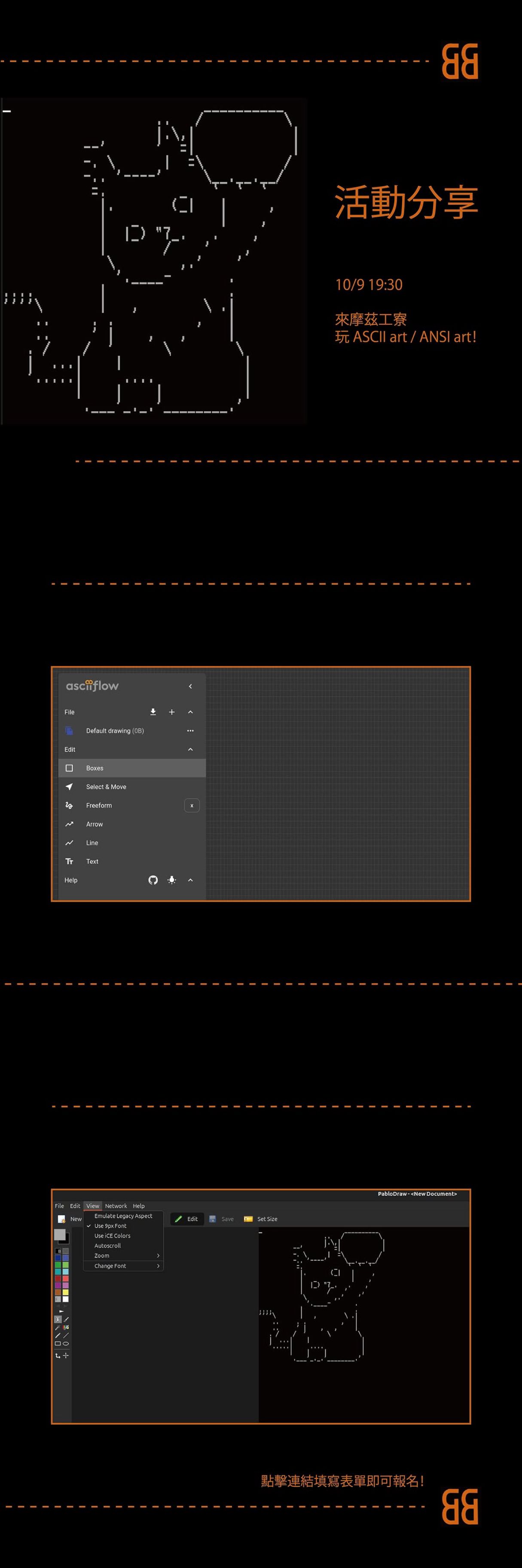 - 【活動分享】摩茲工寮 10/9 workshop 內容: 19:30-19:40 - 歷史簡介、ascii ansi 差異、國內外使用例 19:40-20:30 - 帶大家一起用 ASCIIFlow 畫東西 20:30-22:30 - 創作 & 閒聊 要帶筆電來或至少要有鍵盤 介紹工具: ASCIIFlow, PabloDraw 簡介: 在電腦只能顯示文字的時代,為了傳達圖形資訊,大家用有限的文字硬拼湊出圖案。隨著顯示技術和頻寬的進步,這種創作 -稱作 textmode/ascii ...